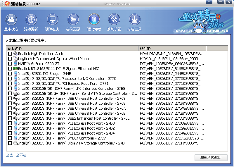 對(duì)于因錯(cuò)誤安裝或其他原因?qū)е碌尿?qū)動(dòng)程序殘留,我們推薦您使用驅(qū)動(dòng)程序卸載功能卸載驅(qū)動(dòng)程序,卸載驅(qū)動(dòng)程序僅需勾選硬件名稱,然后點(diǎn)擊卸載所選驅(qū)動(dòng)按鈕即可完成卸載工作。我們不建議一次刪除多個(gè)硬件的驅(qū)動(dòng)程序。